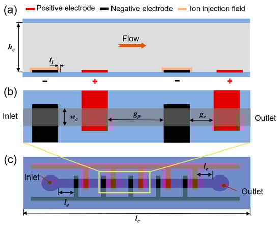 Schematic illustration of simulation field for the ion drag pump. (a) Cross-section schematic, (b) top view of the finite element simulation field, and (c) top view of the proposed EHD chip.