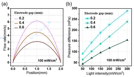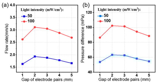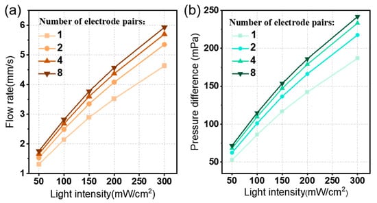 Firstly, the effect of the electrode structure on the pumping performance is investigated, including the number of electrode pairs, electrode gap ge, and electrode pairs gap gp. Figure 7 shows the output performance of the photo-induced ion drag pump in response to the variation of the number of electrode pairs under different light intensities. Obviously, a higher light intensity leads to a greater photovoltage and consequently induces a larger average flow rate uav as shown in Figure 7a. Also, as the number of electrode pairs increases, the flow rate uav increases slowly in a given light intensity, such as from the light intensity of 50 to 300 mW/cm2; the average flow rate changes from 1.3 to 4.6 mm/s (about 3.5 times) and by 1.3 times (from 1.3 to 1.7 mm/s) by increasing the number of electrode pairs from 1 to 8 pairs. Similarly, the pressure difference curve has almost the same trend compared to the average flow rate curve. When increasing the light intensity, the flow rate and pressure difference exhibit an upward trend, as shown in Figure 7b.