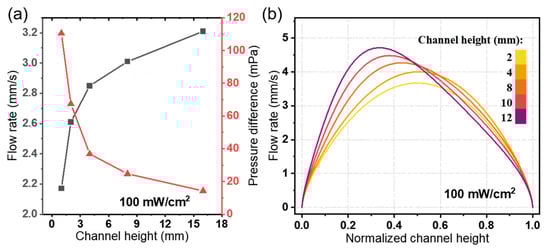 The effect of the channel height on the pumping performance of the photo-induced ion drag pump. (a) Plot of the average flow rate uav and pressure difference pd; (b) the flow rate distribution in the outlet of the channel.