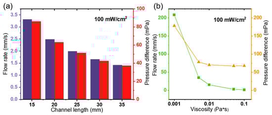 The effect of (a) the channel length and (b) fluid viscosity on the pumping performance of the photo-induced ion drag pump.