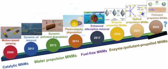 Timeline showing the progress in the use of self-propelled MNMs for environmental applications. Top part in 2011: reproduced from Ref. []. Copyright 2012, the American Chemical Society. Top part in 2013: reproduced from Ref. []. Copyright 2013, the American Chemical Society. Top part in 2017: reproduced from Ref. []. Copyright 2017, the American Chemical Society. Top part in 2020: reproduced from Ref. []. Copyright 2020, the American Chemical Society. Top part in 2021: reproduced from Ref. []. Copyright 2021, the American Chemical Society. Top part in 2022: reproduced from Ref. []. Copyright 2022, the Elsevier Ltd. All rights reserved.