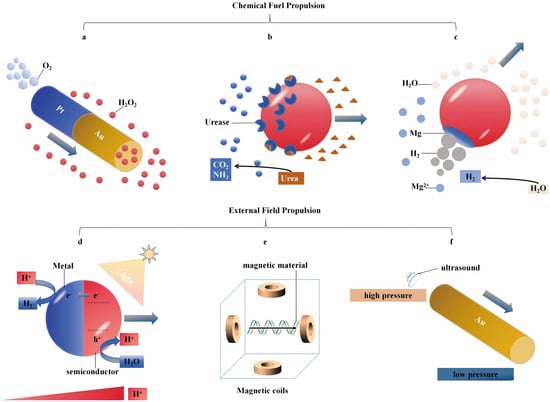Rapid industrialization has led to the release of significant quantities of harmful pollutants into both water and air resources. To protect human health and the environment, it is essential to implement effective pollutant treatment methods, utilizing biological, physical, or chemical processes. However, the effectiveness of these treatment approaches is often limited by diffusive mass transfer, which necessitates the introduction of additional agitation to improve their efficiency. The emergence of micro/nanomotors (MNMs) adds a new dimension to the field of environmental remediation []. Notably, self-driven MNMs that convert energy from their surroundings into movement demonstrate significant potential for addressing the diffusion limitations associated with treatment operations by using autonomously moving substances [,,,,,,,]. Their continuous motion facilitates effective mixing without requiring external agitation, thus minimizing cleaning time and greatly improving efficiency []. Since the initial studies on self-electrophoretic and H2O2-driven MNMs [], researchers have explored various alternative propulsion mechanisms, including the Marangoni effect []; light-induced motion []; and electromagnetic [,,,,,,], thermal [,,,,,,,], optical [,,], ultrasonic [,,,,,,,], and biomixed motions [,]. The integration of efficient propulsion and motion control with easy functionalization, load pulling, swarming, and chemotaxis behaviors has enabled a diverse range of applications for these devices, such as drug delivery [,], analytical sensing [,,], energy production [], and assisted fertilization [].