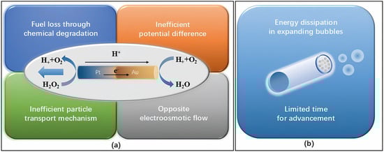 Reasons for the inefficiency of MNMs during self-electrophoresis mechanism and bubble recoil mechanism. (a) In the self-electrophoresis propulsion mechanism, the four energy loss stages of MNMs during the conversion process. (b) In the bubble recoil propulsion mechanism, MNMs have two stages of energy loss during the conversion process.