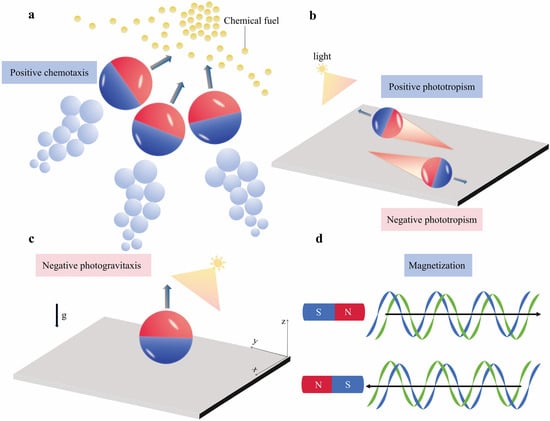 Although the positive results noted in controlled laboratory experiments are promising, real-world environments present complex and continually changing conditions. The propulsive and locomotor functions of MNMs can be affected by variations in the chemical makeup of the surrounding medium or by exposure to unexpected stimuli. Therefore, similar to living organisms, intelligent MNMs must exhibit the ability to adjust their behaviors in response to the dynamic shifts that characterize their surroundings. For instance, E. coli can detect the concentration of chemicals (nutrients) in its vicinity using specialized receptors. Utilizing this sensory information, the bacterium can determine whether it should move towards areas with higher chemical concentrations []. In addition, the vertical migration of plankton within aquatic ecosystems in response to daily fluctuations exemplifies another form of adaptive behavior. Microorganisms exhibit diel vertical migration, a behavioral pattern that enables them to optimize survival by ascending to the surface at night to forage for food and evade predators, then retreating to deeper waters during daylight hours to minimize exposure to threats []. Inspired by such adaptive strategies in nature, MNMs have been designed to navigate their environments through mechanisms such as chemotaxis, phototaxis, and magnetotaxis. These movements are governed by external stimuli, showcasing their ability to respond dynamically to environmental cues [,]. For instance, chemotactic MNMs are known to navigate according to the concentration gradient of fuels or surfactants [,,]. As MNMs align with this gradient, their diffusion rate significantly increases due to the heightened catalytic reaction rates observed at elevated fuel concentrations (Figure 5a). Moreover, phototropic MNMs possess the ability to detect light direction, allowing them to orient themselves and move toward or away from light sources (Figure 5b) [,,,]. Phototaxis is often clearly observable in highly asymmetric structures, and this phenomenon has been demonstrated by the pioneering research of Guan’s group, where smart photo-isotropic semiconductor MNMs were generated by using the finite penetration depth of light to induce chemical reactions on the asymmetric surface of MNMs []. Subsequently, another parallel study of MNMs propelled by phototaxis was reported by Dai’s team. In this, Janus MNMs were composed of Si trunks and TiO2 branches. These structures not only demonstrated programmable phototropic responses, either negative or positive, but also exhibited behavioral traits similar to those found in natural green algae []. Another distinct behavioral response is gravitaxis, characterized by movement influenced by gravitational forces. This response has been noted in MNMs that possess an asymmetric mass distribution or structural arrangement, resulting in movement that opposes gravity. For instance, certain photopelled MNMs have shown a gravitactic response to light, illustrated by the previously mentioned diurnal vertical migration, commonly termed “negative photogravitaxis” (Figure 5c) [,,]. Additionally, MNMs with magnetic responsiveness can alter their movement based on the gradient of the magnetic field or the direction of a dynamic magnetic field, thereby optimizing energy usage [,,]. For example, when the polarity of the magnetic field is reversed, it can apply either an attractive or repulsive force on the MNMs (Figure 5d).