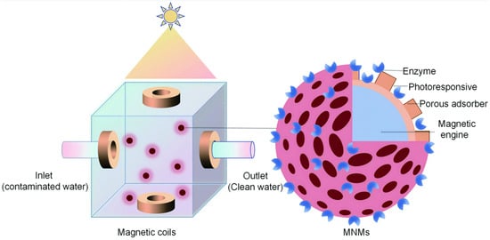 To meet the technical demands described, an ideal MNM must consist of multiple components, each serving specific functions. For example, incorporating a magnetic engine as the core component allows for precise control over its position, speed, and movement path by adjusting the magnetic field settings. To enhance the adsorption efficiency, this engine can be surrounded by a highly porous material with a large surface area that acts as an adsorbent. The adsorbent layer may then be encased within a shell of photoresponsive materials capable of initiating sequential photodegradation pathways. To further improve degradation efficiency, the MNM’s surface can be functionalized with enzymes to accelerate contaminant breakdown []. However, it is essential to reassess the enzyme’s stability when exposed to light or light-induced ROS to ensure that the system remains efficient throughout the remediation process. Such systems must also be environmentally sustainable and more cost-effective than traditional contaminant treatment methods. A full economic evaluation of these MNM-based systems should account for energy usage related to pumping, water quality sensors, controllers for magnetic fields, light sources, and the critical factor of treatment duration. The treatment efficiency depends on variables such as pollutant type, MNM quantity, magnetic field parameters, and light intensity.