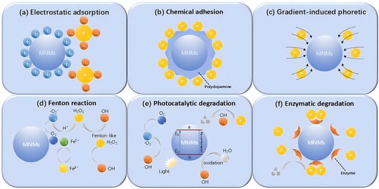Magnetic fields offer a means to effectively control MNMs, providing exceptional maneuverability across various mediums [,]. Instead of relying solely on the principles of attraction and repulsion mediated by magnetic forces, MNMs can navigate through magnetophoresis when subjected to magnetic field gradients or via torque transfer in rotating magnetic environments. For example, helical MNMs can transform rotational movement into linear motion within a rotating magnetic field (Figure 3e) []. Unlike MNMs driven by optical methods, those manipulated magnetically do not possess autonomy and face significant limitations in terms of cost and size due to the requirements of magnetic setups []. The incorporation of magnetic materials such as Fe, Co, and Ni as the magnetic layer of MNMs facilitates their movement in various environmental media when subjected to a magnetic field. This characteristic enables remote control and recyclability of the MNMs []. However, the unique shapes and operational mechanisms of magnetic MNMs are often limited by complex fabrication processes and demanding configurations [].