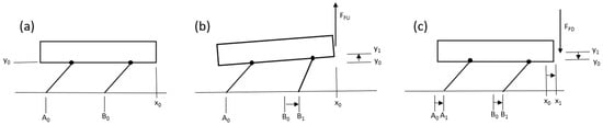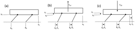 In the first setup, shown in Figure 1a, the resting bristle-bot is in the horizontal position and vertical position , while springs at the hip joints apply torque to maintain its height. In Figure 1b, the centered force lifts the bristle-bot body while both legs rotate counterclockwise (CCW) and slide forward due to the spring force and a reduced friction force. Eventually, in Figure 1c, the centered force pushes the bristle-bot down, and the normal force on the feet increases, to prevent them from slipping. Then, the legs rotate clockwise (CW), and the bristle-bot’s body moves forward.