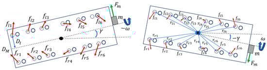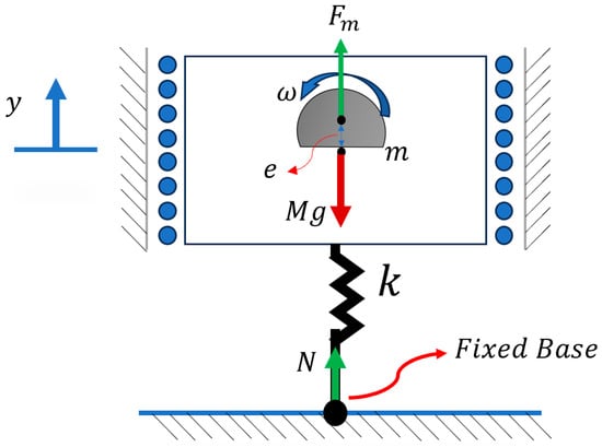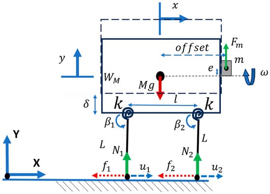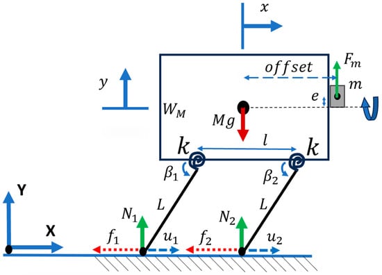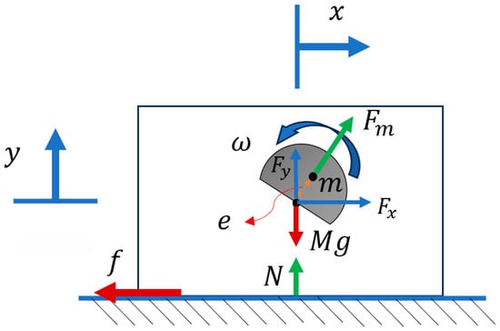 where is the mass of the whole system including the eccentric mass, is the friction force, is the reaction force, and is the gravity; the details to derive each parameter are reported in Appendix A. In this case, if we assume that the system never leaves the ground: