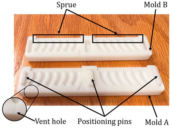 To create the microrobot legs using this technique, Boolean operations were used to derive the leg mold and vertically segment it into the sections A (lower segment in Figure 9) and B (upper segment in Figure 9) with SolidWorks 2022. Also, to guarantee the geometric alignment accuracy between A and B, three positioning pins were designed, corresponding to the protrusions in section A and the indentations in section B. Then, the molds were printed with an LCD 3D printer. Next, part A and part B of Smooth-On Dragon Skin 20 Mold-Making Silicone Rubber (Smooth-On, Macungie, PA, USA) were mixed and poured into the mold displayed in Figure 9. After overnight solidification, the legs of the microrobot were detached from the mold.