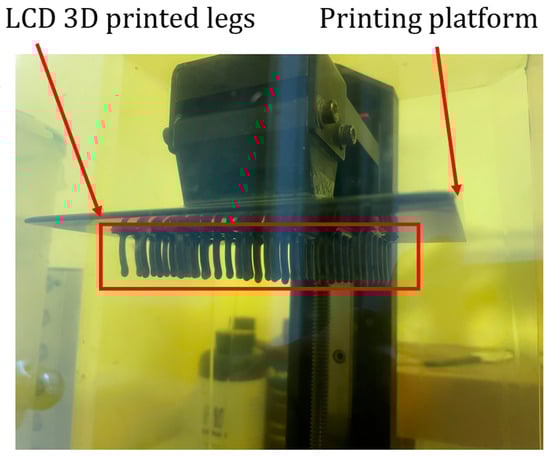 In the development of the prototypes, both FDM and LCD printing could print flexible materials. However, due to the small cross section of the legs, there was insufficient adhesive strength between the FDM-printed layers. Therefore, given that the height of the LCD-printed layers was only 0.05 mm (in contrast to, typically, 0.2 mm for the FDM-printed layers), LCD appeared to be more suitable for printing these small legs. Additionally, during LCD printing, each layer could be cured within 5 s, which resulted in a much shorter LCD printing time compared to that required for FDM printing.