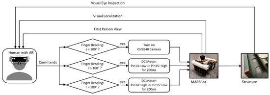 The control scheme used for HRC is illustrated in Figure 11. With this method, humans constantly send commands by bending their fingers, which either streams the visual feedback or steers the microrobot. For steering the microrobot, different values were employed using the trial-and-error method to find the most intuitive value for the duration of the movement and ensure a smooth microrobot coordination by the human operator. In this control scheme, the human operator receives the visual feedback either through their eyes by inspecting the structure and the microrobot location or through the first-person view of the camera on the microrobot in AR, which assists in the coordination of the MARSBot movement to the designated area for inspection.