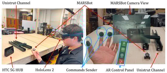 In this process, the operator wore the AR headset (HoloLens 2), and the MARSBot steered whenever the operator bent his fingers, as displayed in Figure 35. Using this method, operators can receive first-person visual AR feedback from the interior of the Unistrut channel, while viewing the outside of the structure with their eyes and steering the MARSBot from the third-person view to facilitate the inspection and human–robot collaboration.