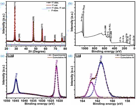 Figure 1a illustrates the crystalline reflections of multiple low-dimensional ZnS nanoparticles measured at room temperature. Along with three highly intense crystal planes, five other planes were observed when the ZnS sample was scanned at 2θ, ranging from 20 to 80°. The three intense planes were located at 28.7°, 47.6°, and 56.5° while other planes were situated at 33.1°, 59.2°, 69.6°, 76.8°, and 79.2° 2θ locations, respectively. Three highly intense sharp diffractions represent (111), (220), and (311) crystal planes, while other low peaks are assigned to (200), (222), (400), (331), and (420) planes, respectively. These diffraction peaks confirm ZnS crystallization into a highly stable sphalerite cubic blende phase with space group F-43m [10,29], which is, accordingly, JCPDF card number 01-086-8469. The distinct diffraction peaks devoid of any impurities indicate a high level of crystallinity and the exclusive presence of the ZnS material’s pure phase characteristics. To get insight into phase purity, XRD patterns of the ZnS were analyzed through Rietveld refinement of crystal structure analysis. Refinement indicates that the diffraction patterns of ZnS are well aligned with space group F-43m and space group number 216. The lattice parameters estimated through refinement are a = b = c = 5.41626 Å, and volume (a3) is 158.891 Å3. Refinement parameters Rwp = 5.25%, Rp = 3.74%, and χ2 = 2.30 confirm the refinement is successful. The determination of the average crystallite size (DA) involved the analysis of three particularly strong planes and the application of the Debye–Scherrer equation [30];