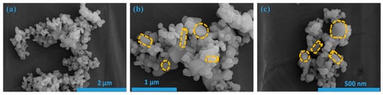 Figure 2a–c illustrates field emission scanning electron microscopy (FE-SEM) images showcasing the as-prepared ZnS sample. FE-SEM images are taken at various magnifications, and these images unveil the emergence of easily distinguishable, low-dimensional nanostructures. To be more precise, when examining Figure 2a, one can observe a cluster of nanoparticles with various shapes/dimensions. This was additionally verified by examining the images at increased magnifications, as represented in Figure 2b,c.