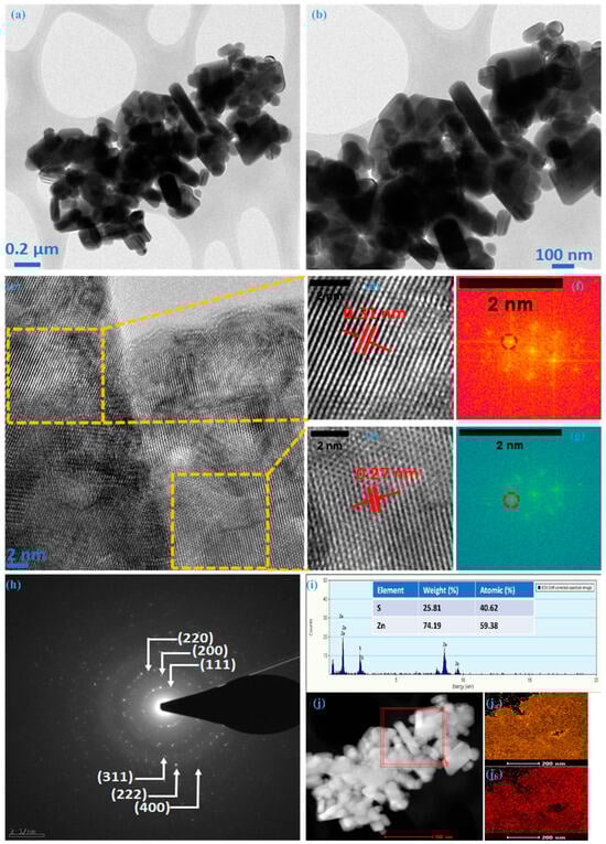 Transmission electron microscopy confirmed the internal morphological and structural evolution of the ZnS sample. TEM images at different magnifications are illustrated in Figure 3a,b, revealing the non-uniform nature of nanoparticles, exhibiting various dimensions; these images represent the silhouettes observed in the FE-SEM analysis. Figure 3c depicts a high-resolution transmission electron microscopy (HRTEM) image showcasing one such particle from the ZnS sample. The lattice fringes in this picture indicate that these multiple-dimensional particles are polycrystalline. Exemplifying a common instance of such particle, the zinc-blende structure was confirmed for ZnS with distinct fringes with an interplanar spacing (d-spacing) of 0.31 nm (Figure 3d and 0.27 nm (Figure 3e), respectively. These fringe patterns are associated with the most intense crystal plane (111) and its adjacent plane (200), respectively. This was further confirmed through spectral patterns (encircled) of the chosen region with different fringes using fast Fourier transform spectroscopy (FFT), as illustrated in Figure 3f,g. The selected area electron diffraction (SAED) pattern, as represented in Figure 3h for the ZnS sample synthesized in this work, exhibits distinct concentric rings corresponding to lattice planes (111), (200), (220), (311), and (222), aligning seamlessly with the cubic structural arrangement. This suggests that TEM and HR-TEM observations align closely with those made using FE-SEM and XRD. Analyzing synthesized nanoparticles through energy-dispersive X-ray spectroscopy (EDX) is a crucial method for determining the atomic percentages of the constituent elements. In Figure 3i, the presented image and data sheet derived from the EDX analysis provide valuable insights. The images distinctly reveal the presence of key elements, i.e., Zn and S without any additional peaks, indicating the formation of ZnS with a 1.31:0.69 (Zn:S) ratio. It suggests that the results obtained from the XPS analysis and EDS align well with the intended elemental composition of the material. Figure 3j reflects the elemental mapping using HAADF-STEM for Zn and S; as illustrated in Figure 3ja,jb, the homogeneous distribution of Zn and S atoms can be noted within the cluster of nanoparticles. Morphological analysis through FE-SEM and TEM verify the creation of ZnS, featuring nanoparticles with multiple dimensions. The predominant presence of multi-dimensional nanoparticles significantly improves electrochemical performance due to the synergistic effects arising from the contributions of individual particles.