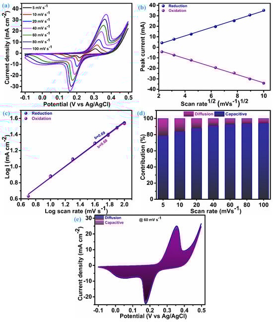 CV and charge transfer analysis, (a) CV at different scan rate, (b) peak current vs. SQRT of scan rate, (c) b-value plot, (d) stacked columns of surface and diffusion contribution, and (e) CV curve at 60 mV.s−1 with area of surface and diffusion.