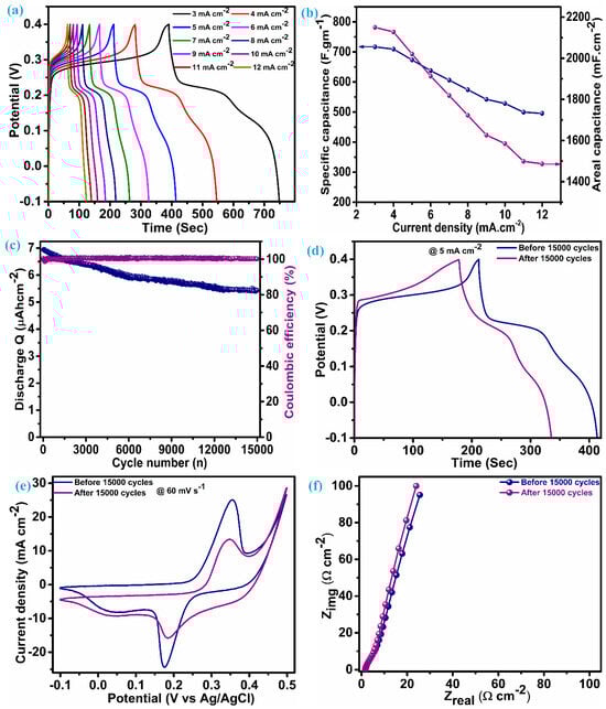 Electrochemical performance analysis, (a) charge–discharge profile, (b) specific and areal capacitance vs. current density, (c) discharge Q and coulombic efficiency, (d) charge–discharge at 5 mA.cm−2 before and after stability, (e) CV at 60 mV.s−1 before and after stability, and (f) EIS curves before and after stability.