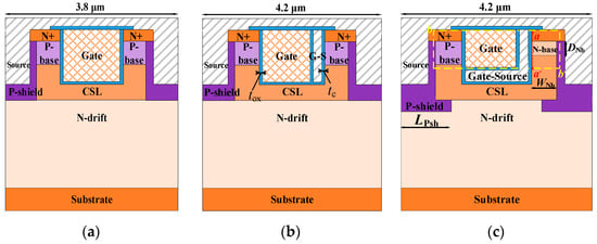 Figure 1 shows the schematic structures of the (a) DT-MOS, (b) DTC-MOS, and (c) proposed MOS. Based on the DTC-MOS, the proposed MOS turns part of the polysilicon gate to the source and extends to the bottom of the gate, forming an “L-shape” split gate. The gate-source connects to the source, so the overlap between the gate and drain decreases, which leads to a decrease in the Cgd. Meanwhile, at the right half-cell, the p-base turns into an n-base, so a low-barrier diode is integrated into this structure to improve its reverse conduction. The P-shield extends to the current spreading layer (CSL), and it decreases the Emox in the blocking state and increases the BV, improving the device’s reliability.
