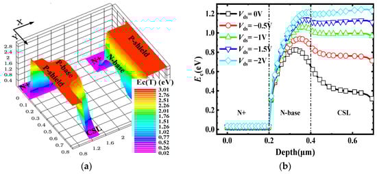 Figure 2a shows the three-dimensional conduction band energy (EC) distribution of the 4H-SiC in the proposed MOS structure at zero bias. The EC decreased from the P-shield to the N-base at the right half-cell. The high doping of the P-shield and the low doping of the N-base led to a rapid depletion of the N-base region at zero bias, preventing the formation of a conducting channel. Therefore, there was no impact on the BV at low doping concentrations. At zero bias, the EC of the N-base was lower than the P-base, allowing electrons to overcome the potential barrier at a low Vds. Figure 2b shows the EC distribution along the a–a’ line (shown in Figure 1) at different Vds. As Vds decreased, the EC increased in both the N-base and CSL. However, the EC of the CSL increased faster than the N-base region. At Vds = −1 V, the potential barrier became very low, allowing electrons to overcome the potential barrier, turning on the low barrier diode.