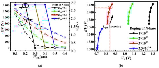 Figure 3a illustrates the impact of WNb and DNb on the BV and VF. The solid circles represent BV values and the dashed circles represent VF values. The WNb varied from 0.1 μm to 0.6 μm in steps of 0.1 μm. As WNb increased, the reverse current path expanded, which led to a decrease in VF. However, the breakdown turned into a punch-through breakdown, which made the device unable to withstand high voltages. With increasing DNb, the length of the potential barrier increased, leading to an increase in VF. In this case, a longer WNb was required to trigger a punch-through breakdown. It is worth noting that when DNb exceeded 0.3 μm, the leakage current of the proposed MOS became comparable to the DT-MOS, which will be further discussed later. To tradeoff the BV, VF, and leakage current, the optimal values of WNb = 0.3 μm and DNb = 0.3 μm were selected.