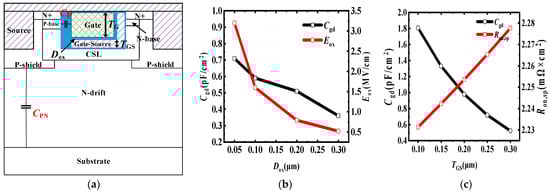 As shown in Figure 4a, Cp is the oxide capacitance between the P-base and gate electrode, which is related to the thickness of the oxide and the overlap between the gate poly and the P-base. CPN is the junction capacitance, which is completely independent of the gate parameters, and the CPN decreases as Vds increases. When increasing TGS or Dox, the TG decreases, resulting in a decreased overlap between the gate poly and the P-base, thus causing a decrease in Cp. Meanwhile, the TG has no influence on CPN, so the Cgd will decrease. However, it is worth noting that the Cgd is already sufficiently small, and further decreasing Cp cannot significantly change the Cgd. To ensure a suitable gate resistance for device, a sufficient volume of gate poly must be considered, which cannot be reflected in a simulation. Therefore, TGS = 0.1 μm was selected for further simulations. According to Figure 4b,c, the internal parameters of the gate trench have little influence on the performance of the device when the resistance of the gate poly is not considered; this shows that the proposed MOS has a wide process window for forming the L-shape gate-source.