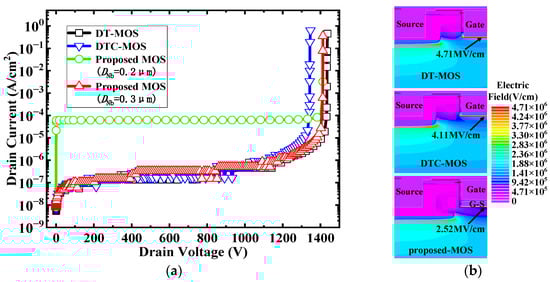 (a) BV characteristics (b) electric field distributions with a drain bias at 1200 V of the DT-MOSF, DTC-MOS, and proposed MOS.