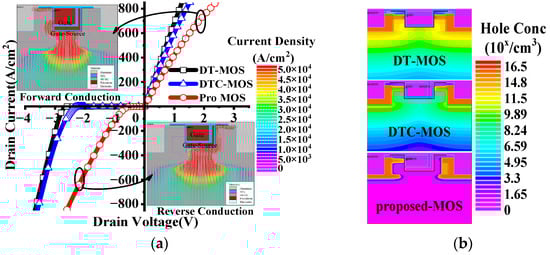 The I–V characteristic is shown in Figure 6a. In forward conduction, the Ron,sp of the DT-MOS and DTC-MOS was smaller than for the proposed MOS; this is because the DT-MOS has two channel paths for conduction, and because both DT-MOS and DTC-MOS do not extend the P-shield, which increases JFET resistance. With a low barrier diode, the VF of the proposed MOS decreased significantly. The VF was 2.85 V, 2.63 V, and 0.85 V at 100 A/cm2 for the DT-MOS, DTC-MOS, and proposed MOS, respectively. The current vector of the forward and reverse conduction is also shown in Figure 6a. It can be seen that there was only one current path for both conduction conditions. The current flows from the N+ region through the N-base to the drift region in reverse conduction, while the current flows from the drift region through the P-base to the N+ region in forward conduction. Figure 6b shows the hole concentration at Is = 100 A/cm2 of all the devices. In reverse conduction, the drift region of the DT-MOS obtained a high concentration of holes, which causes bipolar degradation [5].