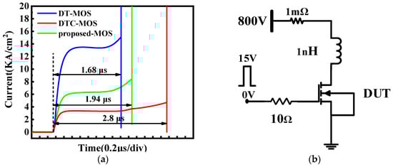 The short-circuit (SC) test results for the DT-MOS, DTC-MOS, and proposed MOS are shown in Figure 7. The SC test circuit used in the simulation is shown in Figure 7b. The bus voltage was 800 V. The stray inductance and resistance was 1 nH and 1 mΩ, respectively. The gate resistance was 10 Ω. A single pulse of 0 V/15 V gate bias was applied to the gate contact until the device failed due to thermal runaway caused by excessive temperatures. The time from device turn-on to failure was 1.6 μs, 1.9 μs, and 2.8 μs for the DT-MOS, DTC-MOS, and proposed MOS, respectively. For the DT-MOS, the highest saturation current caused a faster temperature rise, leading to earlier device failure. Due to the single current channel and depletion layer extension of the P-shield region, the proposed MOS exhibited the lowest saturation current. As a result, the proposed MOS achieved the longest time until failure.