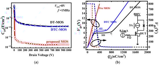 In the proposed MOS, the gate-source extended to the bottom of the gate, leading to a decrease in the overlap between the gate and the drain. As a result, the proposed MOS had the lowest Cgd compared to the DT-MOS and DTC-MOS, as shown in Figure 8a. While switching transients, the time constant is determined by the junction capacitance and gate resistors, which impact the switching speed of the devices. With a smaller capacitance, the devices switch at a faster speed. The Cgd was 141.68 pF/cm2, 136 pF/cm2, and 1.81 pF/cm2 for the DT-MOS, DTC-MOS, and proposed MOS, respectively. Figure 8b shows the gate charge for the three devices; the Qgd of the DT-MOS was 569 nC/cm2 and the Qg (Vgs = 15 V) was 1467 nC/cm2. The Qgd of the DTC-MOS was 406 nC/cm2 and the Qg was 1136 nC/cm2. However, the Qgd of the LST-MOSFET was 6.7 nC/cm2 and the Qg was 333 nC/cm2; this result is consistent with the results for the Cgd, indicating that the proposed MOS can significantly reduce switching losses.