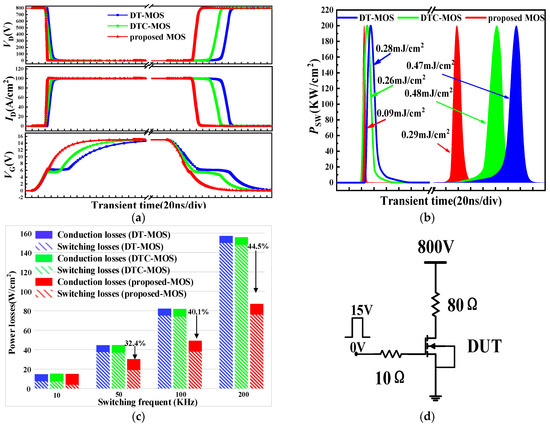 The switching waveforms and test circuit of the three devices are shown in Figure 9. Figure 9d shows the resistance switch circuit used in the simulation, with a load current of 10 A (100 A/cm2) at a normal current density. As can be seen in Figure 9a, the proposed MOS exhibited a lower Qgd compared to the other devices. The miller plateau almost disappeared, leading to a faster transition of Vgs, which is consistent with the Cgd results. This characteristic resulted in a significantly faster switching speed for the proposed MOS compared to the other devices, thereby reducing switching losses. From Figure 9b, the turn-on loss (Eon) and turn-off loss (Eoff) of the DT-MOS was 0.28 mJ/cm2 and 0.47 mJ/cm2 and for the DTC-MOS was 0.26 mJ/cm2 and 0.48 mJ/cm2. However, for the proposed MOS, the Eon and Eoff decreased to 0.09 mJ/cm2 and 0.29 mJ/cm2. The switching losses (ESW) consisted of the Eon and Eoff; the ESW of the proposed MOS was 49.3% and 48.6% lower than that of the DT-MOS and DTC-MOS, respectively.