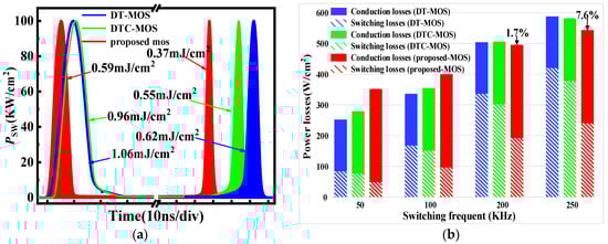 The switching condition at a high current density (500 A/cm2) is shown in Figure 10. As the current density increased, both conduction losses and switching losses increased significantly. The ESW of the three devices is shown in Figure 10a. The proposed MOS value was 0.96 mJ/cm2, which was 42.9% and 36.4% lower than the DT-MOS and DTC-MOS. However, the conduction losses of the proposed MOS increased faster than the other devices at 500 A/cm2. As a result, the Pt of the proposed MOS was the highest before f = 200 KHz, as shown in Figure 10b. At a f of 250 KHz, the Pt of the proposed MOS was only 7.6% lower than that of the DT-MOS. Comparing the work conditions between a normal current density and a high current density, it is more favorable for the proposed MOS to work at a normal current density.
