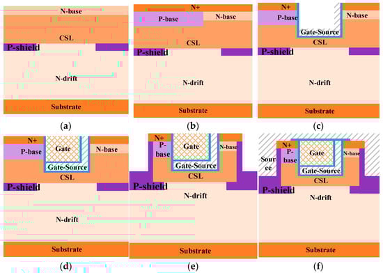 Figure 11 shows a possible process for the proposed MOS. The process starts with the formation of the P-shield region after epitaxy, as shown in Figure 11a. Then, the P-base and N-source are formed by ion implantation followed by high-temperature annealing, as shown in Figure 11b. After this, the gate trench is etched, the gate oxide is formed by chemical vapor deposition (CVD), and the polysilicon is deposited and etched to form the gate-source, which is shown in Figure 11c. Then, the oxide is deposited and the N+ polysilicon is deposited and etched to form the gate electrode, which is shown in Figure 11d. Figure 11e shows the etching of the source trench and tilted implantation to form the P+ region along the sidewall of the source trench. Finally, Figure 11f shows the deposition of a passivation layer, the etching of the contact window, and the formation of the ohmic contact.