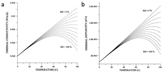In the presence of moisture, (a) the thermal conductivity of air decreases; similarly, (b) the thermal diffusivity of air decreases. The decrease starts at approximately 40 °C and the effect becomes more pronounced as temperature and moisture increase. Figures obtained from [] with permission.