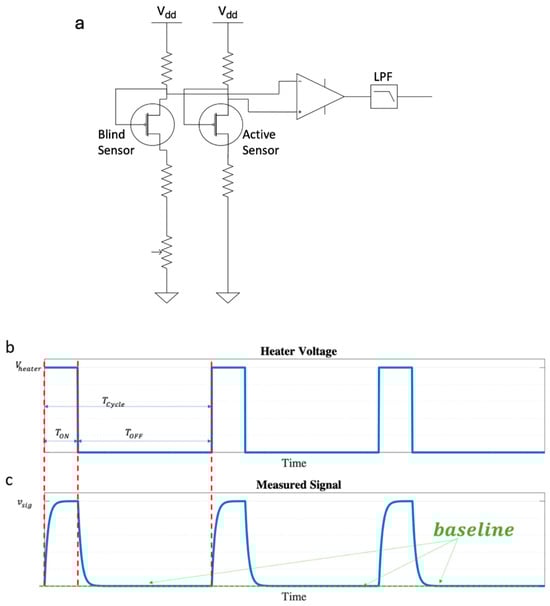(a) Schematics of the differential, bridge-like circuit controlling the operation point at subthreshold; (b) the heating cycle imposed by the circuit in the form of periodic pulses, denoted by Tcycle; (c) the measured signal as a function of time correlates with the heater voltage pulses. The measured signal is defined relative to the baseline, which is presented. The vertical dashed red lines relate the data of (b,c) in the same time interval.