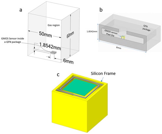 The model for simulation: (a) The gas region including the QFN (Quad Flat Non-Lead) package, simulating the gas box at the lab only smaller to reduce simulation time. (b) A cross-section of the QFN package where the GMOS sensor is mounted. The QFN dimensions correspond to the commercial chip carrier, which we use. (c) The modeled single pixel of the GMOS sensor die, where the frame is shown. The top layer is the micromachined reaction plate and held with two arms to conserve planarity.