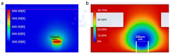 Steady-state simulation results: (a) Temperature; blue is around 300 K; the temperature is increased only in the vicinity of the heating resistor on the device; the color bar of (a) represents the temperature of the heated membrane (the highest temperature represented by the red color at the edge 500.89 K) and the blue color represents the temperature of the ambient at 300 K. (b) Relative humidity; red is around 50% relative humidity; in the vicinity of the packaged device, the relative humidity is very low because of the high temperature imposed on the reaction plate. The color bar of (b) represents the relative humidity near the heated membrane (the lowest relative humidity represented by the blue color at the edge 0.07%) and the red color represents the relative humidity in the ambient at 50.75%.