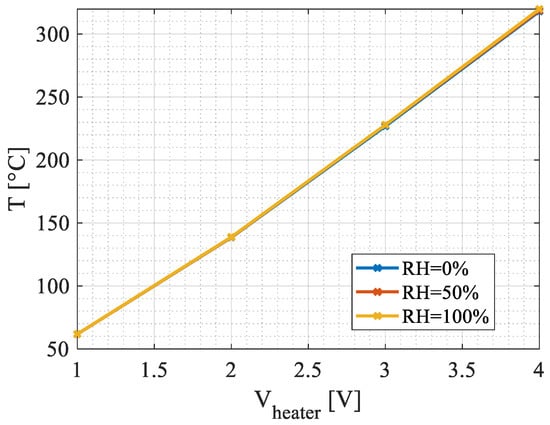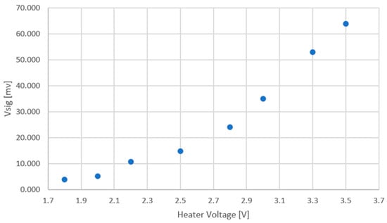 In the measurement setup described above, the temperature increase of the TMOS is translated into , while the heater temperature is determined by the voltage applied to the heating resistor denoted by depending on the humidity (see Figure 7). The value of is directly proportional to the gas concentration , while the ignition temperature (T*) is specific to the gas for a given catalytic layer, thus enabling both the identification as well as concentration determination of the analyzed gas.