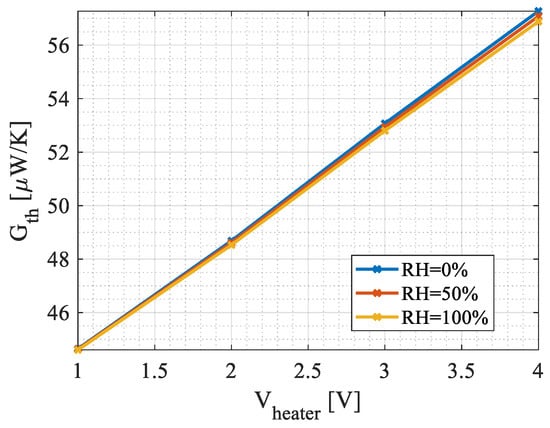 Leveraging the simulation results, the thermal conductance of the device was determined. Figure 8 presents the values calculated by simulations. As expected, increases with temperature. As explained in Section 2, for a given heater voltage and hence temperature, is slightly reduced if humidity increases.