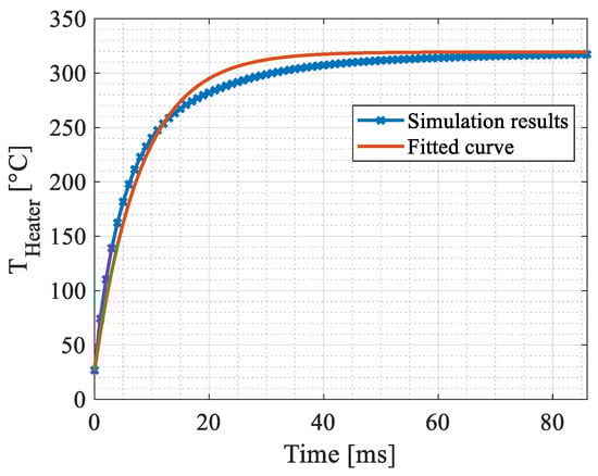 Transient simulation results of the heater temperature. The applied voltage was set to 4 [V] and the environmental relative humidity was set to 50%.