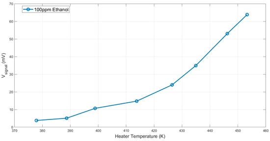 Measured results for 100 PPM of ethanol as an example gas, in the presence of moderate humidity of 50%. The signal voltage is plotted against the heater voltage.