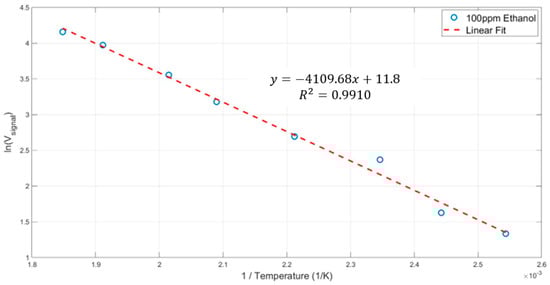 ln(V) signal as a function of 1/T yielding the energy of activation for ethanol.