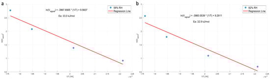 ln(V) signal as a function of 1/T yielding the energy of activation for 30 PPM of ethylene: (a) 58% relative humidity; (b) 82% relative humidity. The activation energy is practically the same at both humidity values. The measurements were performed at ambient (lab) temperature of 23 °C.