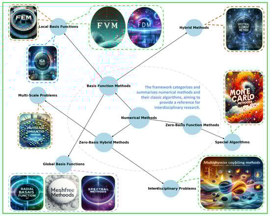 Following a detailed exploration of the interdisciplinary modeling framework for continuum robots and magnetic soft robots, numerical simulation emerges as a critical step in realizing these models. Discretization is often necessary to enhance the programmability of the robot models []. To meet the complex demands of interdisciplinary research, we have meticulously developed a novel classification strategy based on a theoretical perspective of basis functions. This categorization divides numerical methods into three major types (Figure 2): basis function methods, zero basis function methods, and hybrid zero basis methods. Within basis function methods, we further distinguish between global basis functions (such as spectral methods), local basis functions (like finite element methods), and hybrid methods (e.g., spectral-element methods). Zero basis function methods primarily encompass a range of specific algorithms, including Boltzmann lattice and Monte Carlo methods. Meanwhile, hybrid zero basis methods include innovative approaches to multiscale or interdisciplinary issues, particularly suited for complex problems such as fluid–structure interaction.
