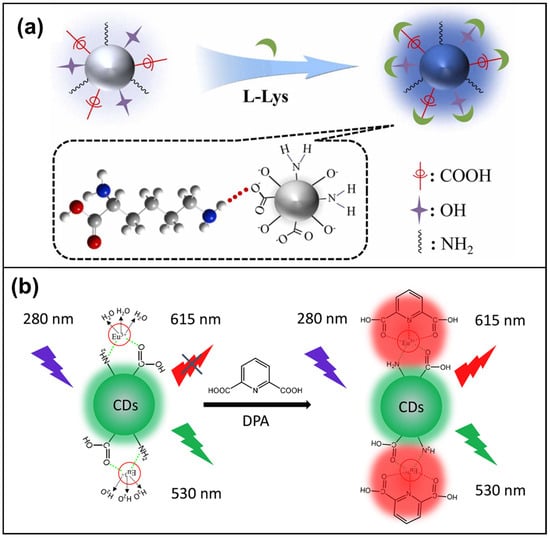 (a) Schematic of proposed route for carboxyl-, hydroxyl-, and amino groups-functionalized CDs for the detection of L-Lysine []; (b) schematic illustration of the carboxyl- and amino groups-functionalized CD probe for the detection of DPA [].