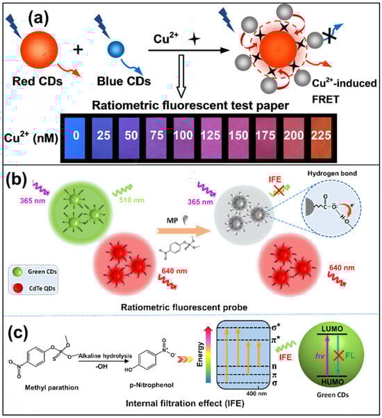 (a) Dual-colored CD ratiometric fluorescent test paper for the semiquantitative assay of Cu2+ []; (b) integration of green CDs and CdTe quantum dots for highly selective quantitative detection of MP []; (c) sensing mechanism of internal filtration effect (IFE) of p-NP to green CDs (* represents the excited state) [].