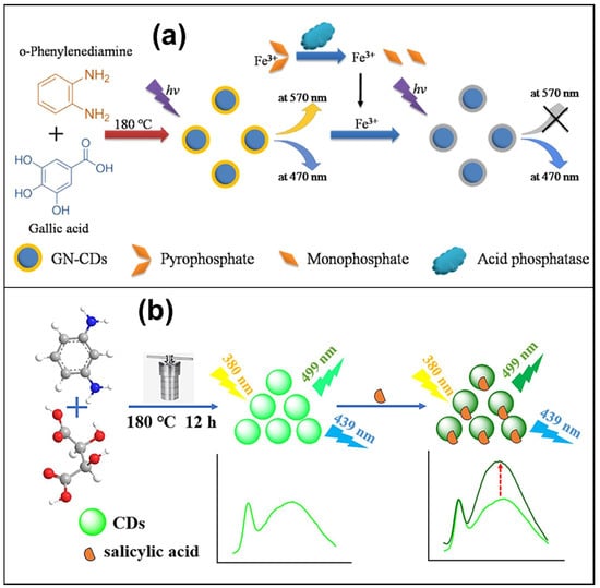 (a) Gallic acid and o-phenylenediamine were used as raw materials to prepare dual-emission CDs exhibiting two fluorescent emission peaks at 470 and 570 nm, respectively []; (b) the CDs, synthesized using tartaric acid (TA) and m-phenylenediamine (mPD) through a straightforward one-step hydrothermal method, display two fluorescence emission peaks at 499 nm and 439 nm when excited at 380 nm [].