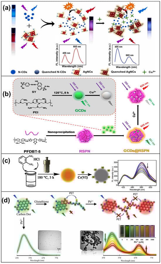 (a) Upon the introduction of Cu2+, the red fluorescence of AgNCs diminishes due to the robust chelating interaction between L-glutathione and Cu2+, while the blue fluorescence undergoes a resurgence, leading to a notable shift in fluorescence color from pink to blue under UV light []; (b) a dual-emissive fluorescent ratiometric probe for Cu2+ was developed by loading amine-coated CDs onto red emission semiconducting polymer nanoparticles (RSPN) through electrostatic adsorption []; (c) schematic illustration of Y-CDs preparation and the quenching process upon the addition of Cr(VI) to the system []; (d) the average dynamic size of m-AP-GSH CDs transformed from 1.67 nm without Pb2+ to 289.3 nm after Pb2+ addition, indicating significant aggregation of the CDs with Pb2+ [].