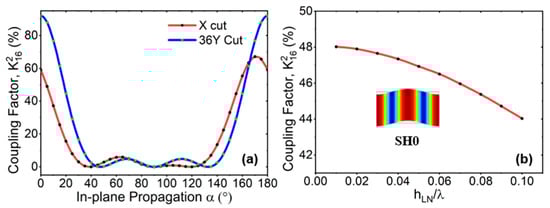 To quantitatively compare different orientations, the electromechanical coupling is studied under a quasi-static approximation, where i is the electric field direction and j is the stress component. Figure 1a shows versus in-plane-propagation direction α for the SH0 mode based on X and 36Y cuts. Compared with commonly used X-cut [,,,,], 36Y-cut has larger . Here, the Euler rotated angle is (α, 54, 0) for 36Y-cut. The electrode-arrangement direction is along the x-axis direction after Euler rotation, and α represents the in-plane direction of wave propagation. The is defined as follows []: