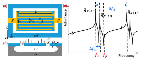 where i and j are the wave vectors of the longitudinal and transverse modes and is the phase velocity of the acoustic wave. For a device with N electrodes, is the desired main mode. In operation, electric fields introduced by the top electrode induce periodic strain and stress fields, forming acoustic modes of various orders, as depicted in Figure 2c []. To form spurious-free filters, the nature of spurious modes in a typical LiNbO3 LVR needed to be investigated first, before spurious-mode-mitigation feature could be developed.