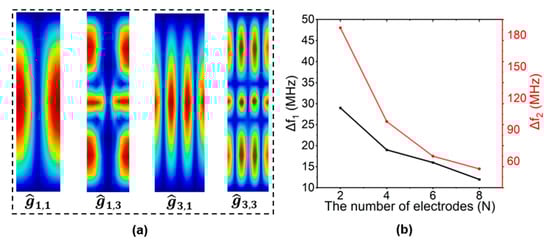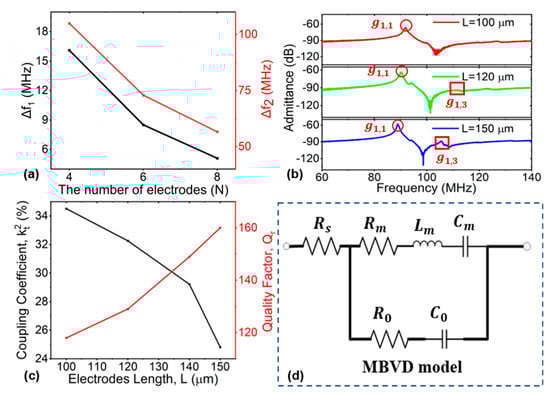 For a resonator with a particular number of electrodes (more than 2), spurious modes occur at various frequencies. When the number of electrodes increases, the higher-order transverse () and longitudinal () modes are often positioned closer to the desired mode (). The minimum number of interdigitated electrodes (N = 2) would make the value of and reach maximum ( and represent the frequency gap between the fundamental mode and high-order longitudinal mode , the fundamental mode , and high-order transverse mode , respectively), as shown in Figure 3b. This can contribute to distancing and attenuating higher transverse and longitudinal modes, and it can also create a large spurious-free range for comprising filters. Consequently, the main mode distances from and attenuates higher-order longitudinal and transverse modes to the greatest extent when the number of electrodes N = 2, creating the largest spurious-free space.